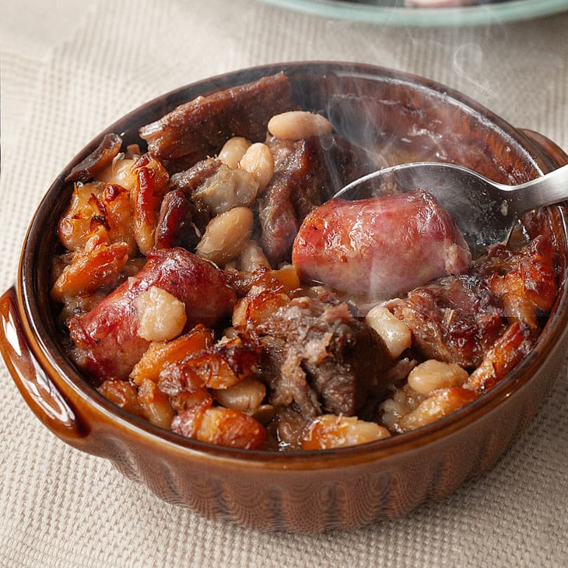 カスレは、白いんげん豆と自家製トゥールーズソーセージを深い土鍋で煮込んで作ります。2名様用の本格的な味を忠実に再現しました。