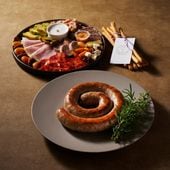 アペロボックス (L):約470g(ボックス内寸:直径17.5cm/高さ4cm) 自家製 トゥールーズソーセージ:500グラムパック(渦巻き状のソーセージ×1) |