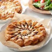 フランス語で「太陽のタルト」を意味する「タルト・ソレイユ」。2枚のパイ生地で具材を挟み、放射線状に切り込みを入れ、一切れずつねじって焼き上げるタルトです。フォトジェニックなビジュアル、指でつまんで食べられるカジュアルさで、パーティー料理として親しまれています。