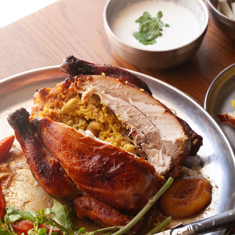 「ビリヤニ」とは、パキスタンやインドに伝わる伝統料理で、スパイスの風味豊かな炊き込みご飯のこと。アターブルでは、「香り米」と称される高級米「バスマティーライス」を使用。シナモン、クローブ、クミン、ローリエ、カルダモン、ターメリックといった多彩なスパイスと共に炊き上げ、パラパラなのにしっとり感もある絶妙な食感に炊き上げました。香り豊かなビリヤニを、ふっくら柔らかい肉質の若鶏にたっぷり詰めて、香ばしくロースト。ガーリックやハーブ、スパイスの食欲をそそる香りと若鶏のうま味をたっぷり含んだバターとオリーブオイルのコク深いソースを絡めてお召し上がりください。