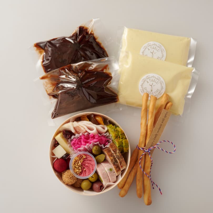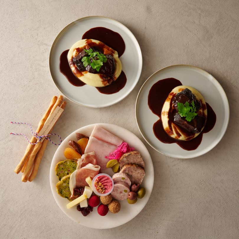 フランス人シェフが厳選した全18品が入った、特別なひとときのための「アペロボックス-MOMENT-」とホロホロの牛ホホ肉と濃密ソースに、マッシュポテトがついた「牛ホホ肉の赤ワインブレゼ」のお得な2名様用セットです