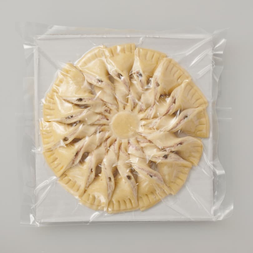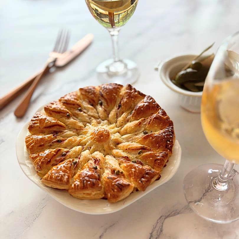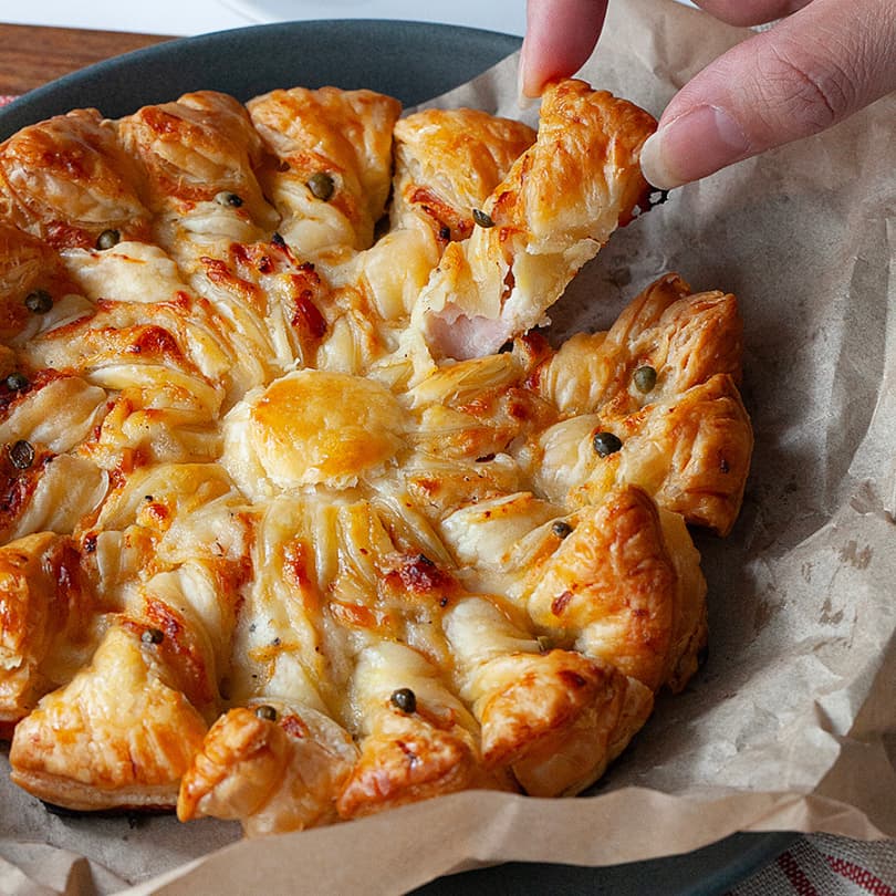 フランス語で「太陽のタルト」を意味する「タルト・ソレイユ」。2枚のパイ生地で具材を挟み、放射線状に切り込みを入れ、一切れずつねじって焼き上げるタルトです。