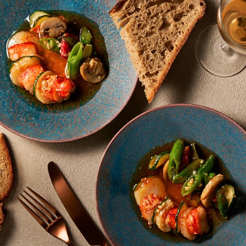 オマール海老と帆立を主役に、旨みを引き出したオイルと香ばしく仕上げた野菜を合わせた贅沢なアヒージョ。オマールの濃厚な風味と帆立のやさしい甘みが重なり合い、奥行きのある味わいに仕上げました。